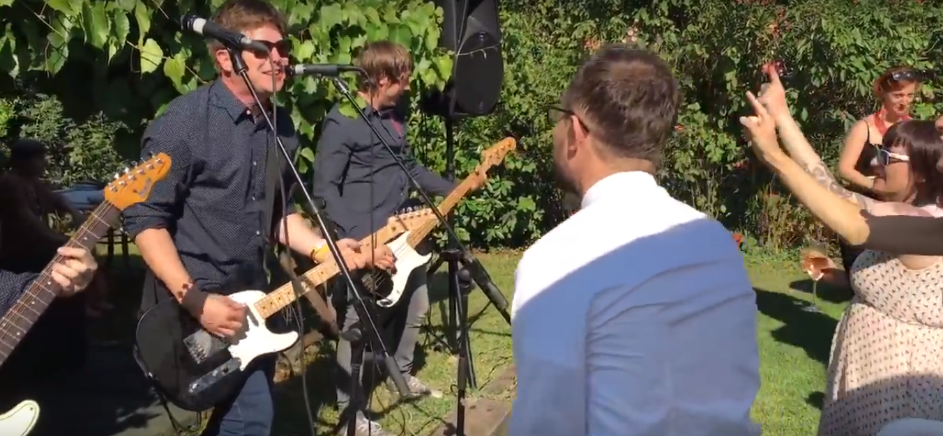 The band then plays the 1996 song “I Wanna Hump You” for the Italian newlyweds and their guests. In another video, the band plays “Sikome Beach” from Born on the First of July as the groom happily moshes and dances by the front row.